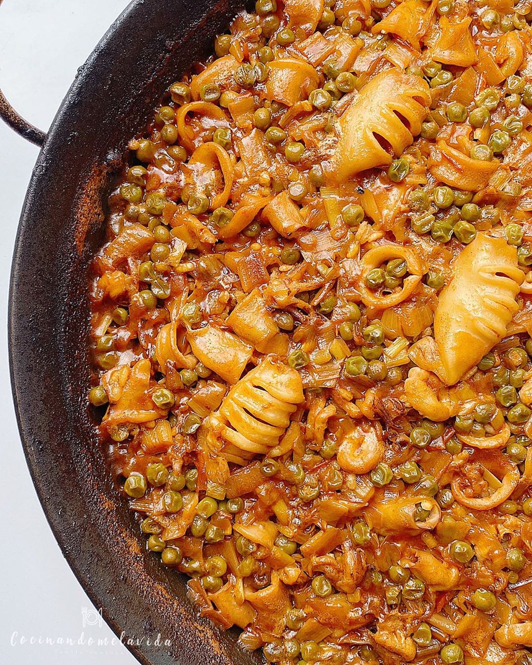 - Añadiremos los guisantes y por último añadimos 2 dientes de ajo picaditos.