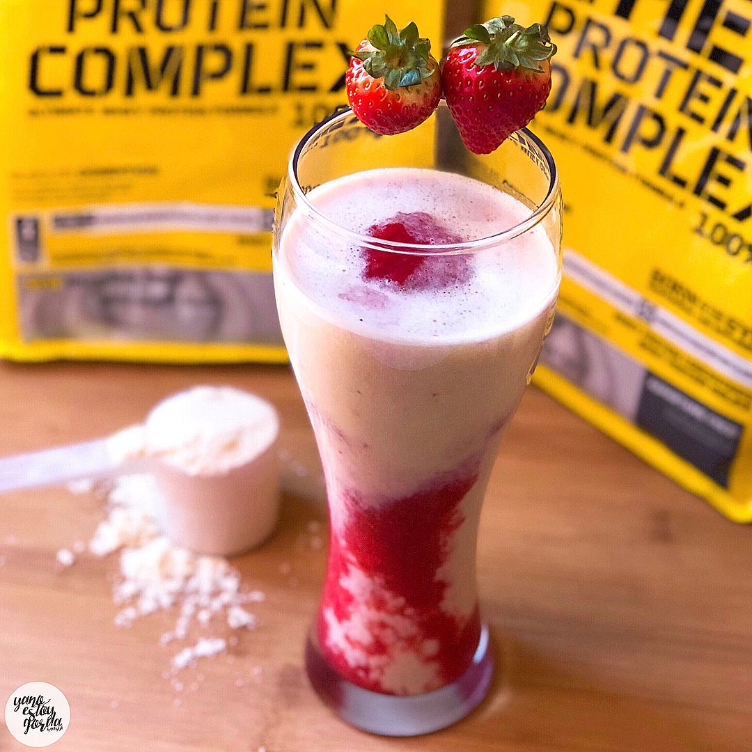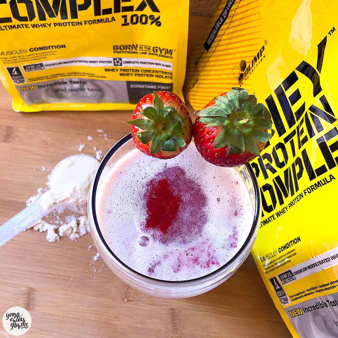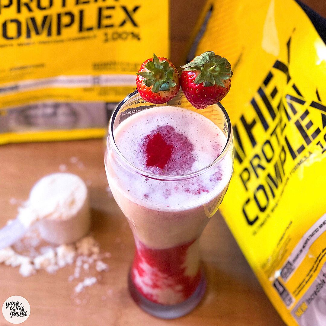 - Seguidamente batimos bien la proteína en polvo con la bebida vegetal y servimos encima de las fresas.