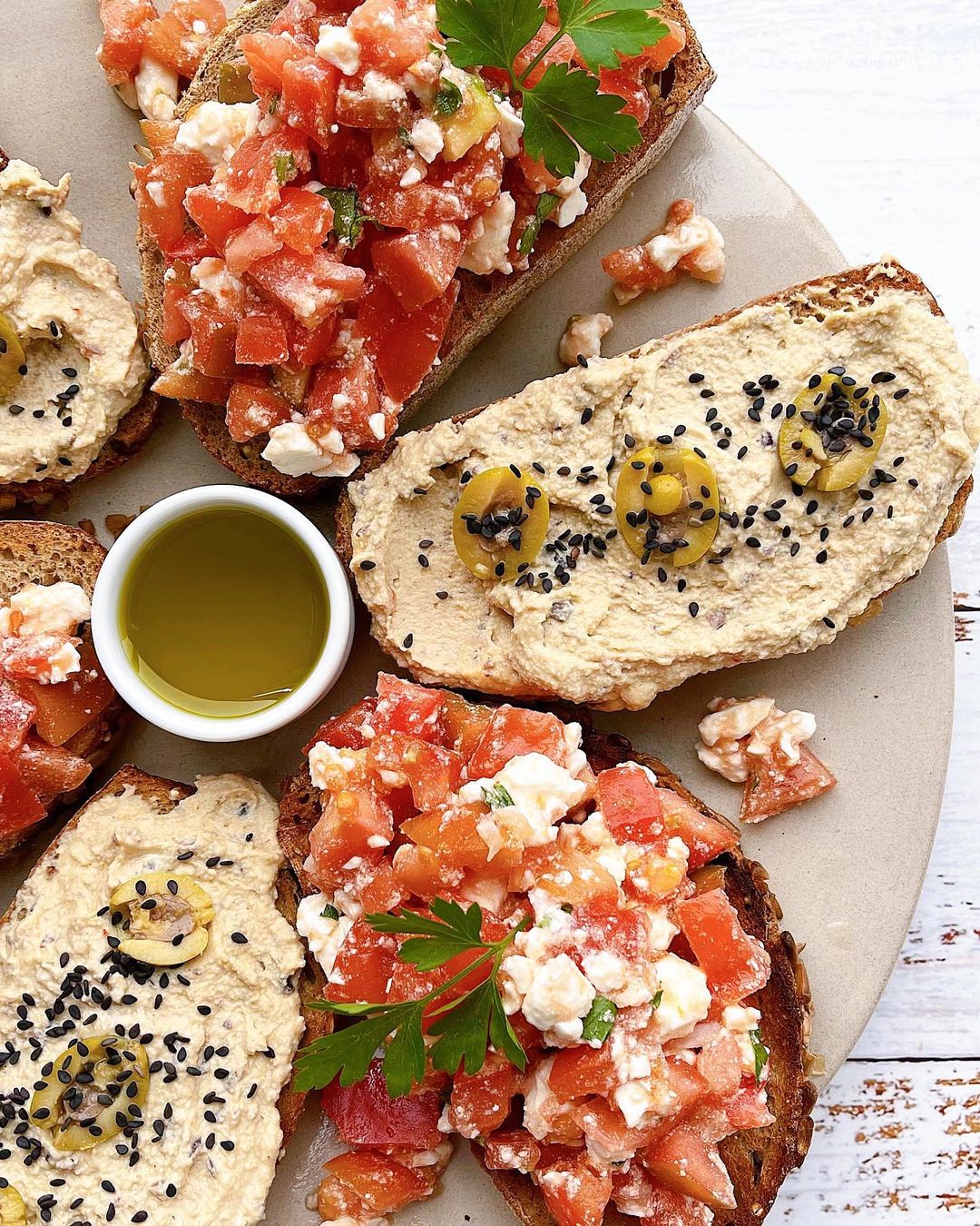- Untamos unas rodajas de pan con hummus, les ponemos ponemos unas aceitunas rellenas y sésamo por encima.