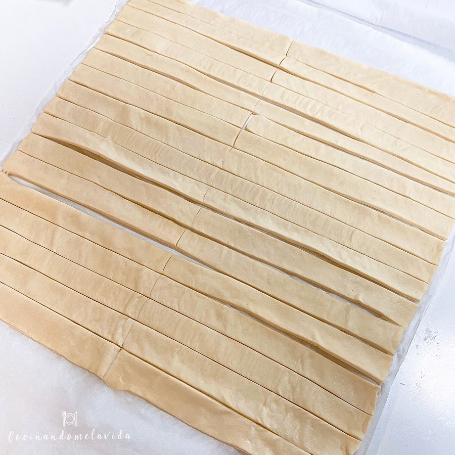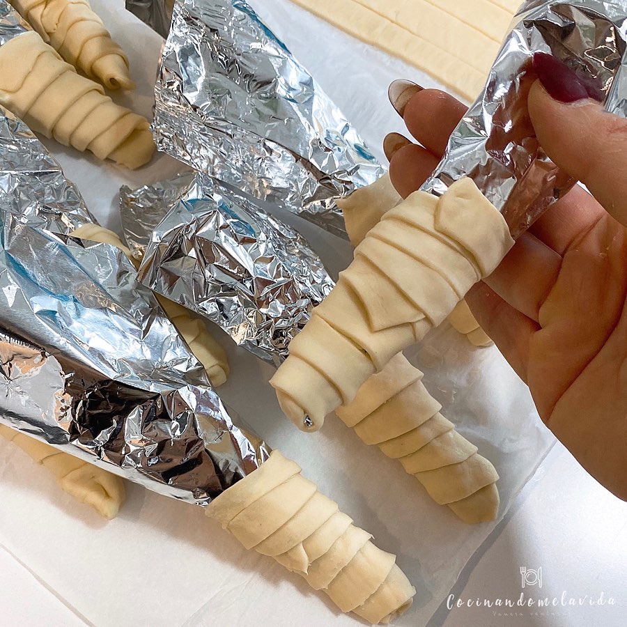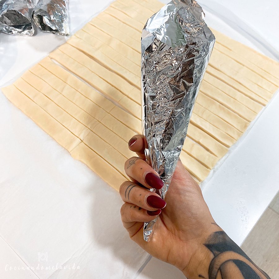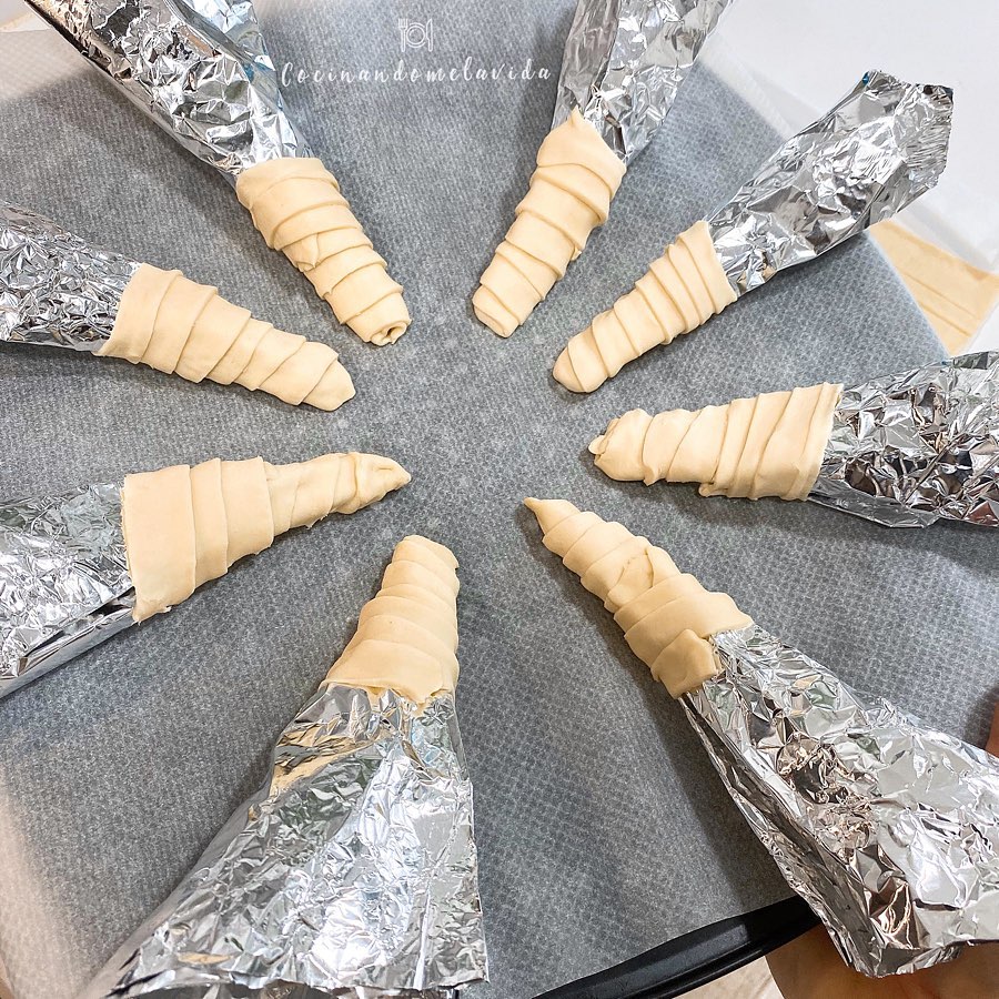 - Cortamos el hojaldre en tiras y cubrimos los cucuruchos dando forma.