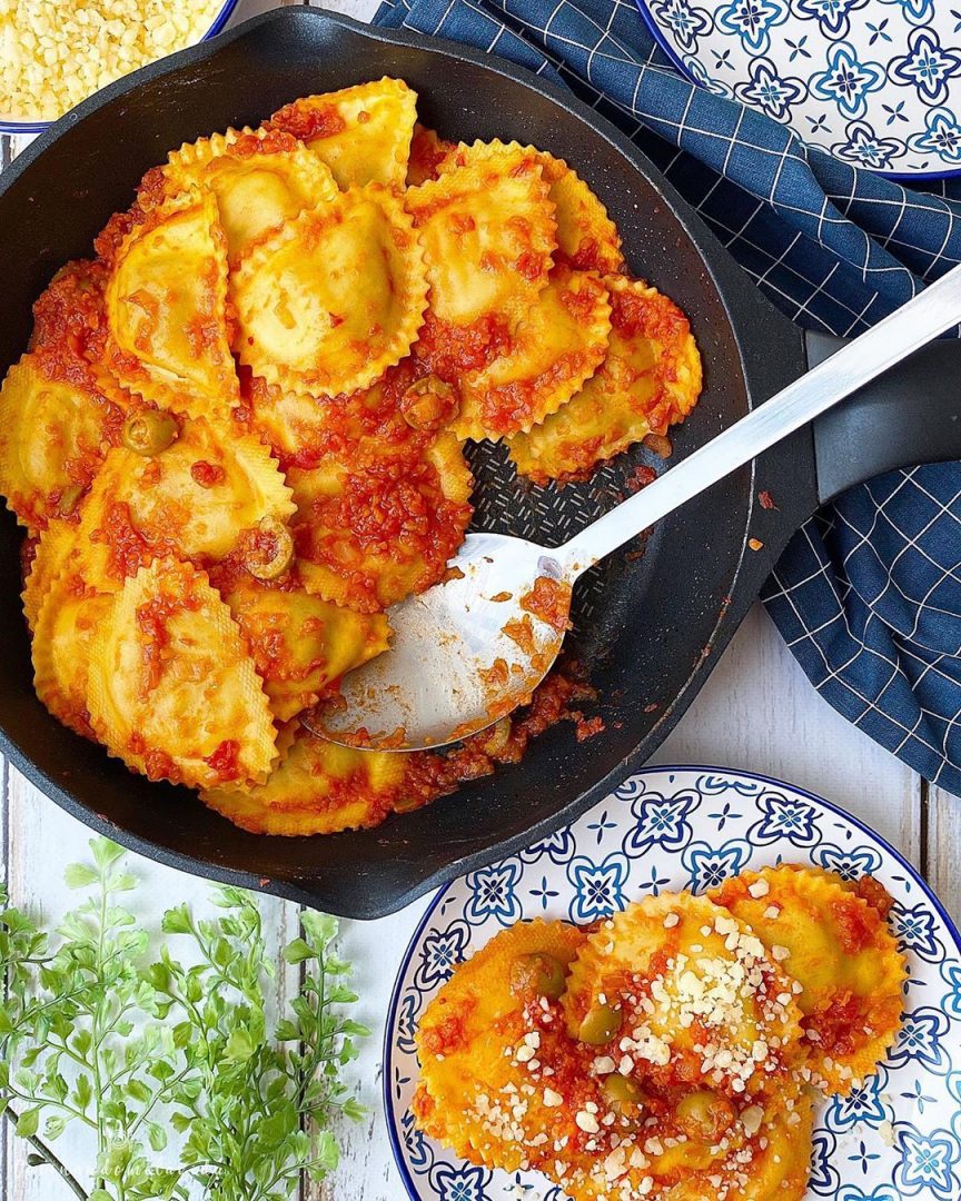 RAVIOLIS DE SETAS Y RICOTTA CON SALSA DE TOMATE CON ACEITUNAS
