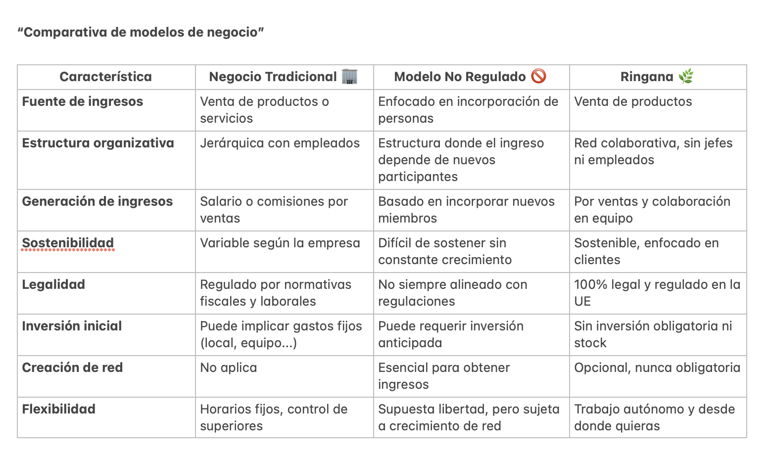 En el mundo del marketing de recomendación, es común que surjan dudas sobre cómo funcionan los modelos de negocio, especialmente cuando se habla de empresas nuevas o disruptivas. En este artículo te explico cómo opera Ringana, una marca ética, sostenible y legalmente establecida en Europa, cuyo modelo de negocio se basa en la venta directa y la recomendación auténtica.