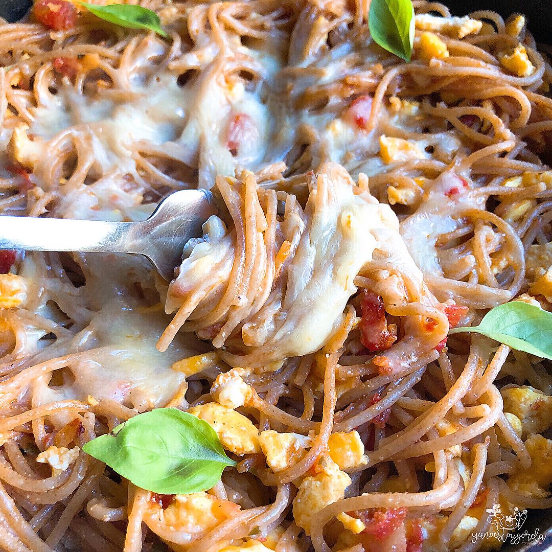 - Mezclamos la pasta con la salsa y añadimos los huevos revueltos.