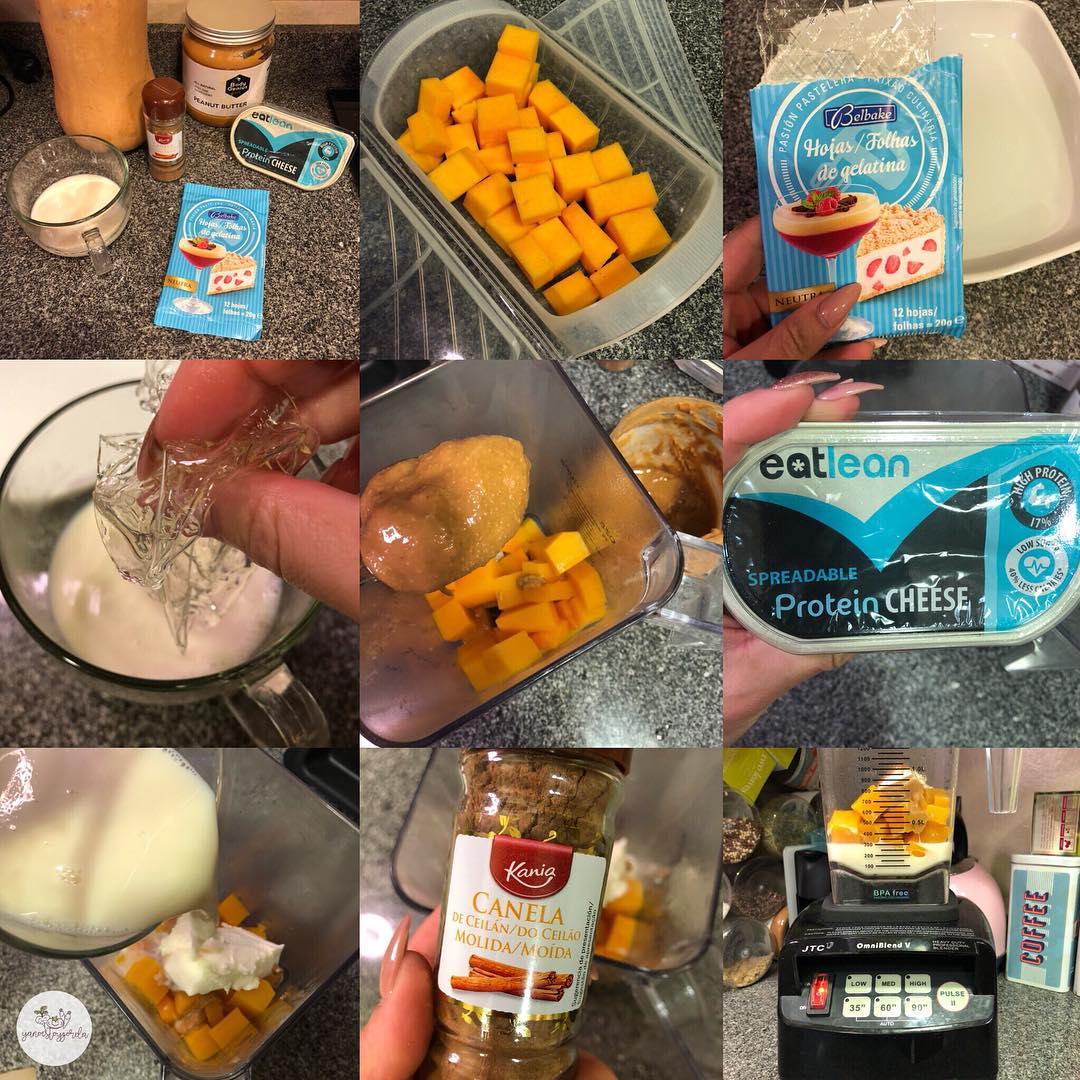 - En una batidora de vaso añadimos la calabaza cocida, la manteca de cacahuete, el queso proteínico untable, la bebida con gelatina, la canela y trituramos bien.