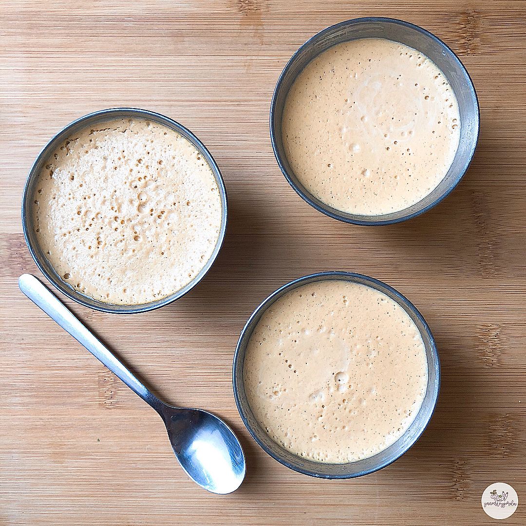 - Escurrimos la gelatina, la añadimos a la bebida vegetal caliente y mezclamos bien para que se disuelva.