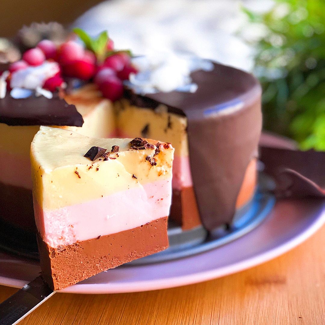 - ¡Listo! Ya tenemos nuestros Mousse cheesecake de cacao, frambuesas y vainilla