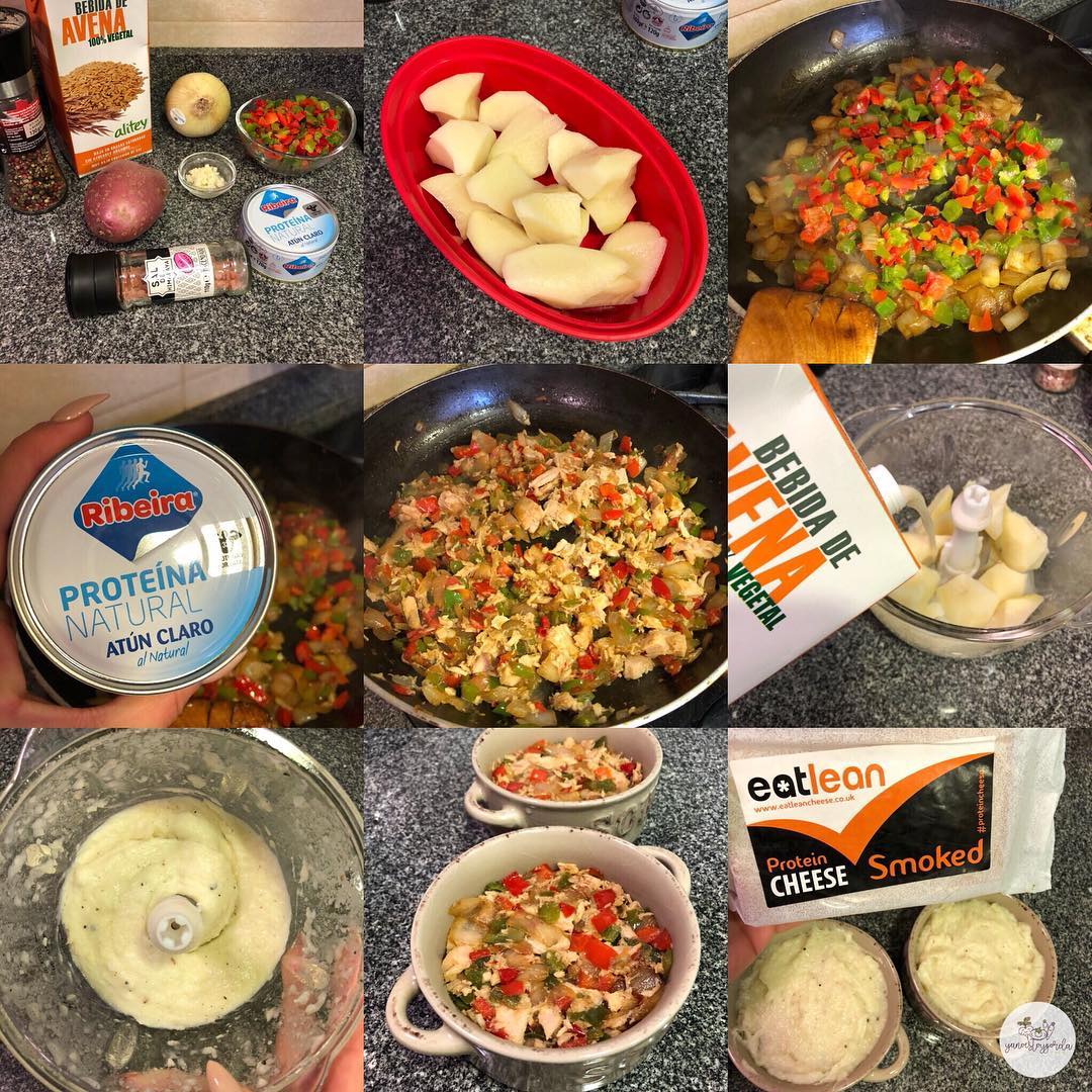 Con el pimiento pochado es el momento de añadir el atún al natural Ribeira bien escurrido y desmenuzado, lo rehogamos bien y apagamos el fuego. - Montamos nuestro pastel poniendo una capa de verduras con atún en el fondo, otra capa de puré de patata y un poquito de queso proteínico eatlean rallado por encima.