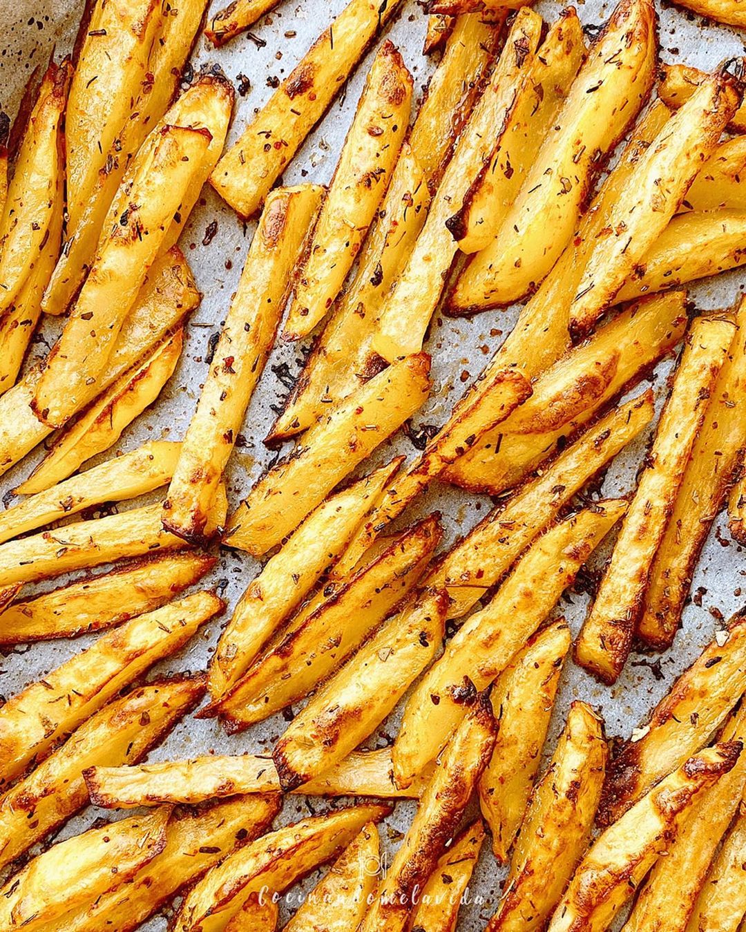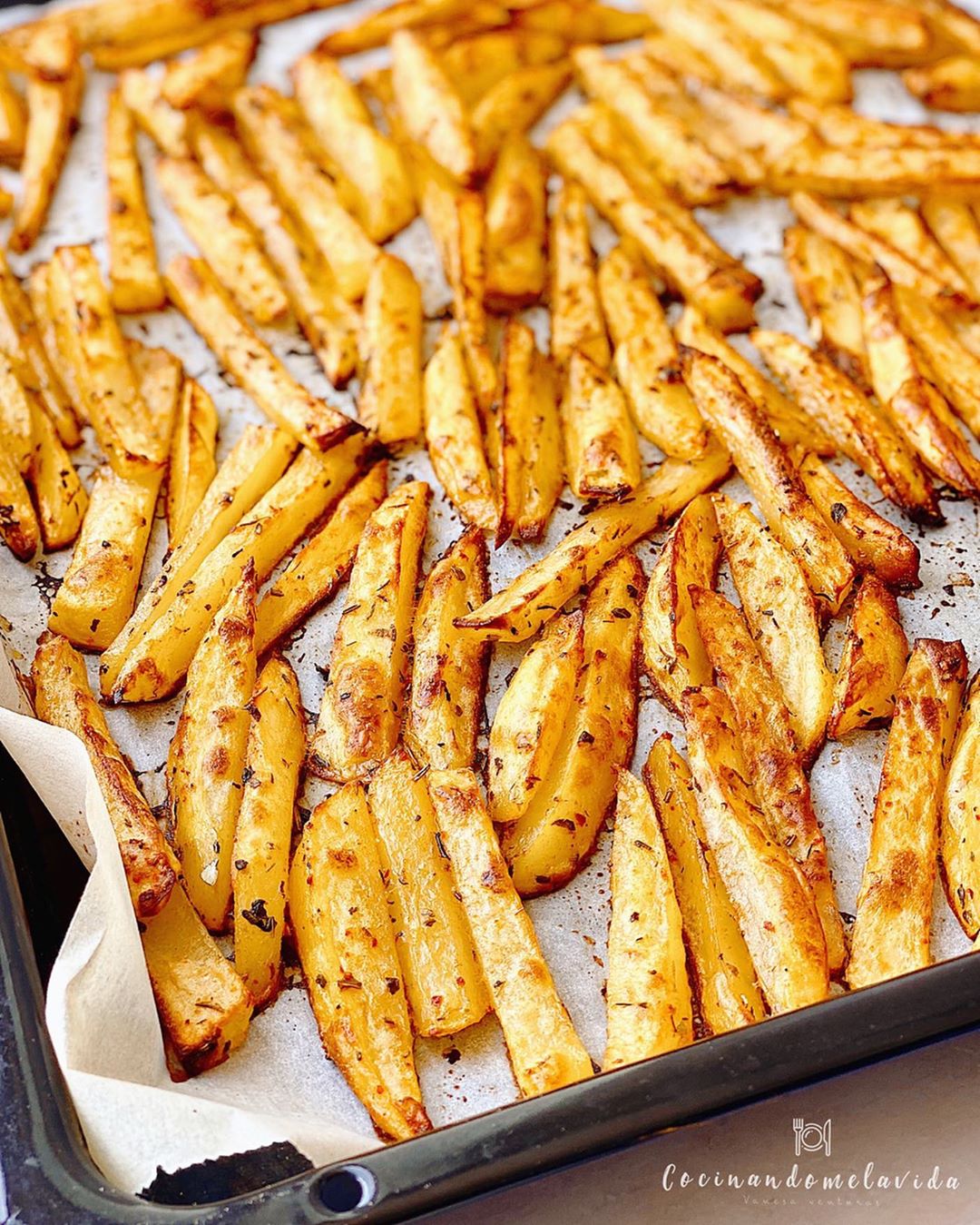 - Llevamos las patatas (sin la bolsa) sobre un papel de hornear en una bandeja apta para el horno.