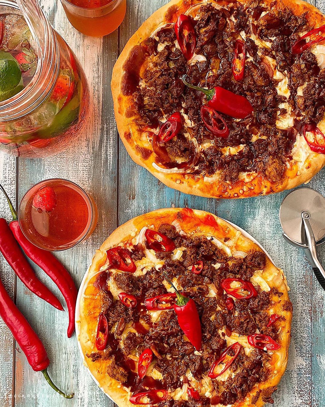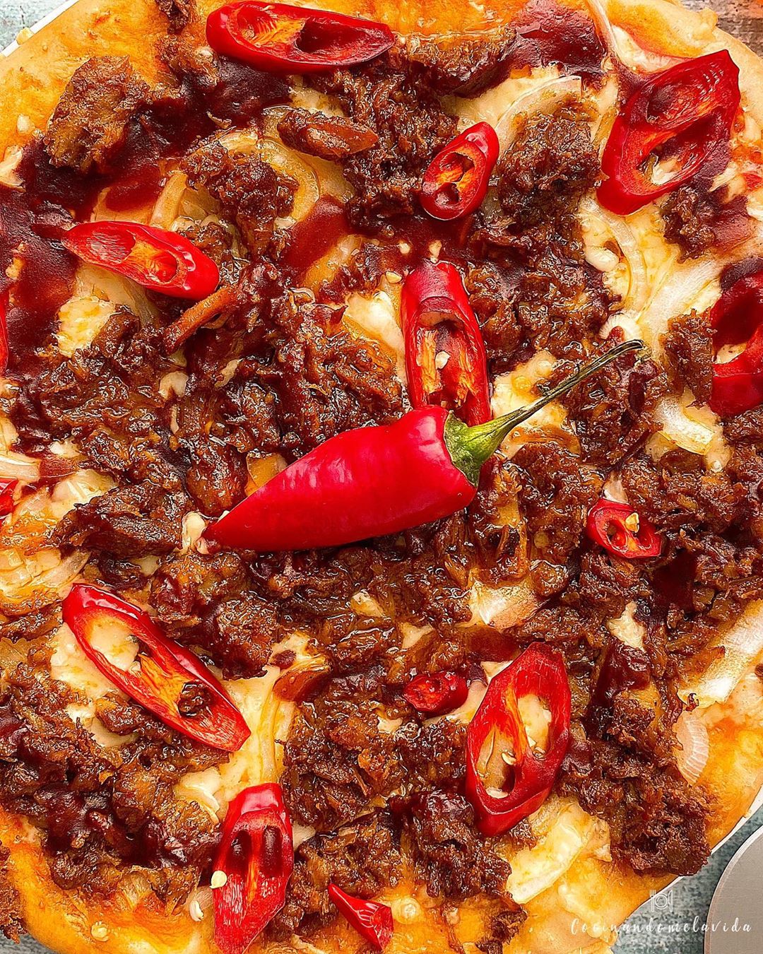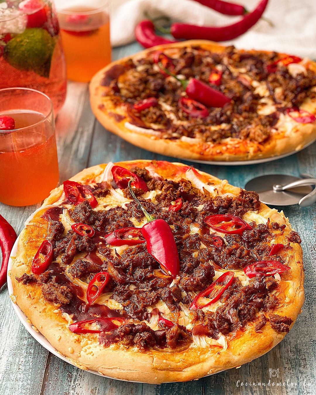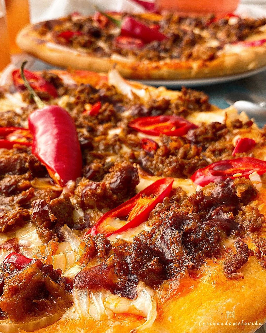 - Ponemos el topping: salsa de tomate, queso, cebolla, pulled pork, chile rojo y salsa barbacoa.