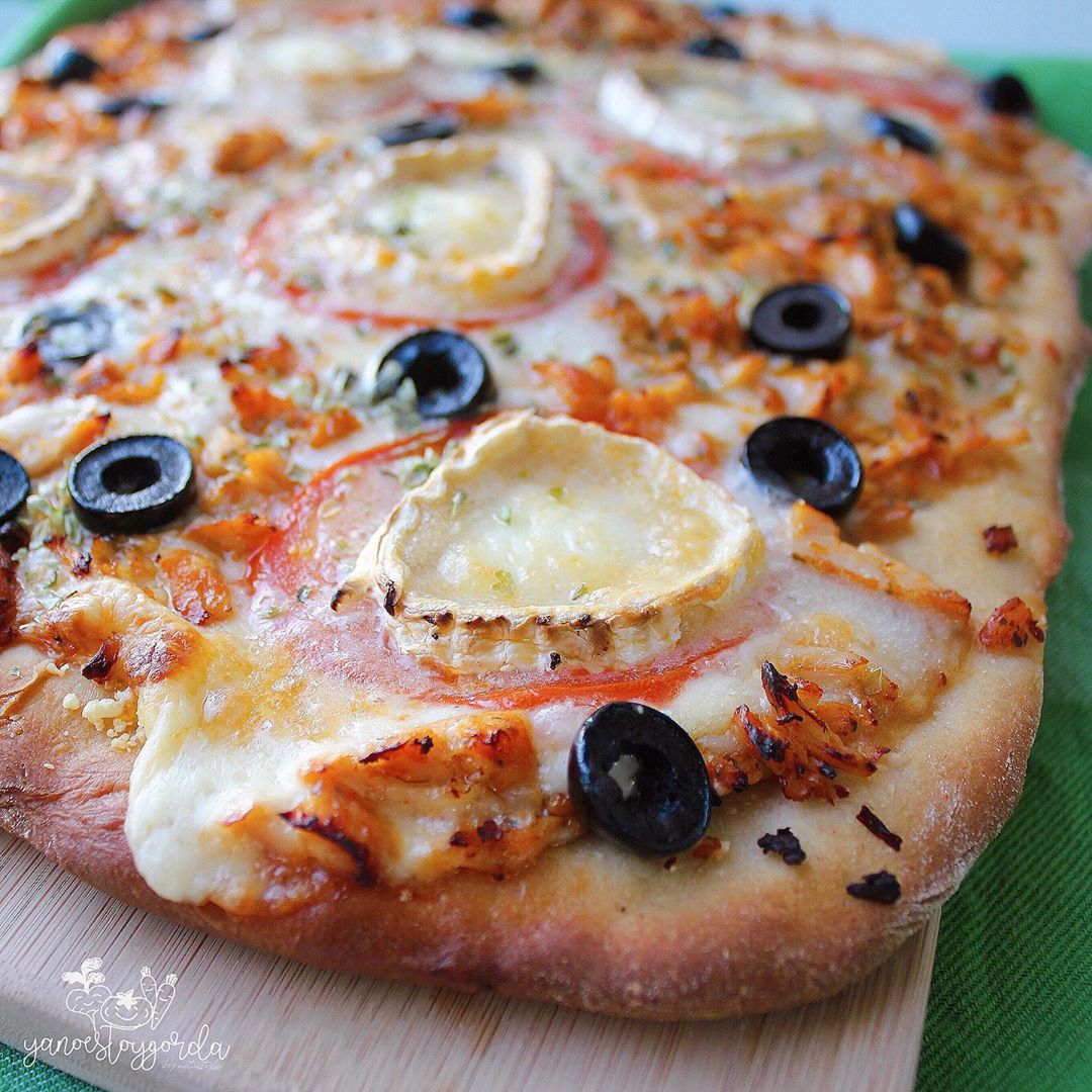 - Agregamos el topping: salsa de tomate, ajo en polvo, quesos, rodajas de tomate, pollo, queso de cabra y olivas negras.