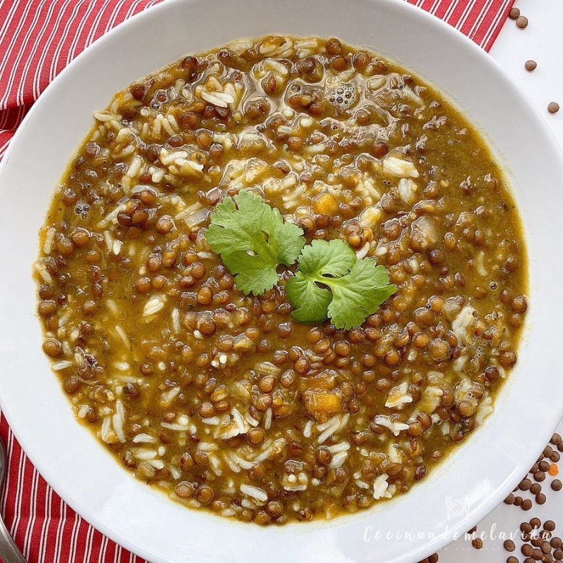 LENTEJAS CON ARROZ AL CURRY Estos son los ingredientes que necesitas: 250g de lentejas pardinas 80g de arroz basmati cocido 1 Cebolla 1 Puerro 200g de calabaza cruda 2 Ajos Laurel Curry en polvo Agua o caldo de verduras Sal…