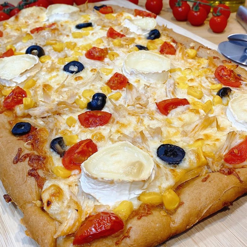 PIZZA FAMILIAR DE ESPELTA CON POLLO Y QUESO DE CABRA