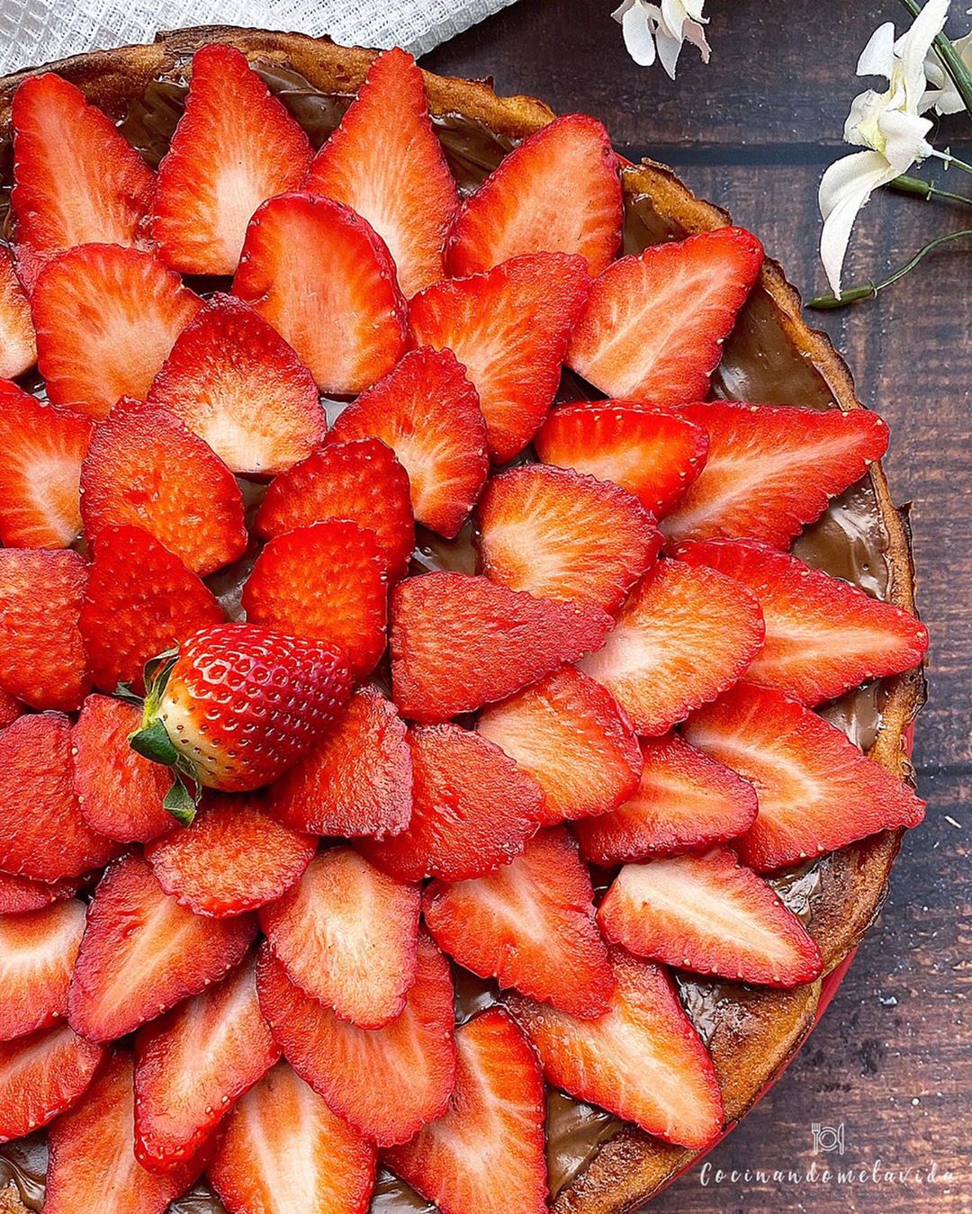 - Lavamos, cortamos y colocamos las láminas de fresas por encima.