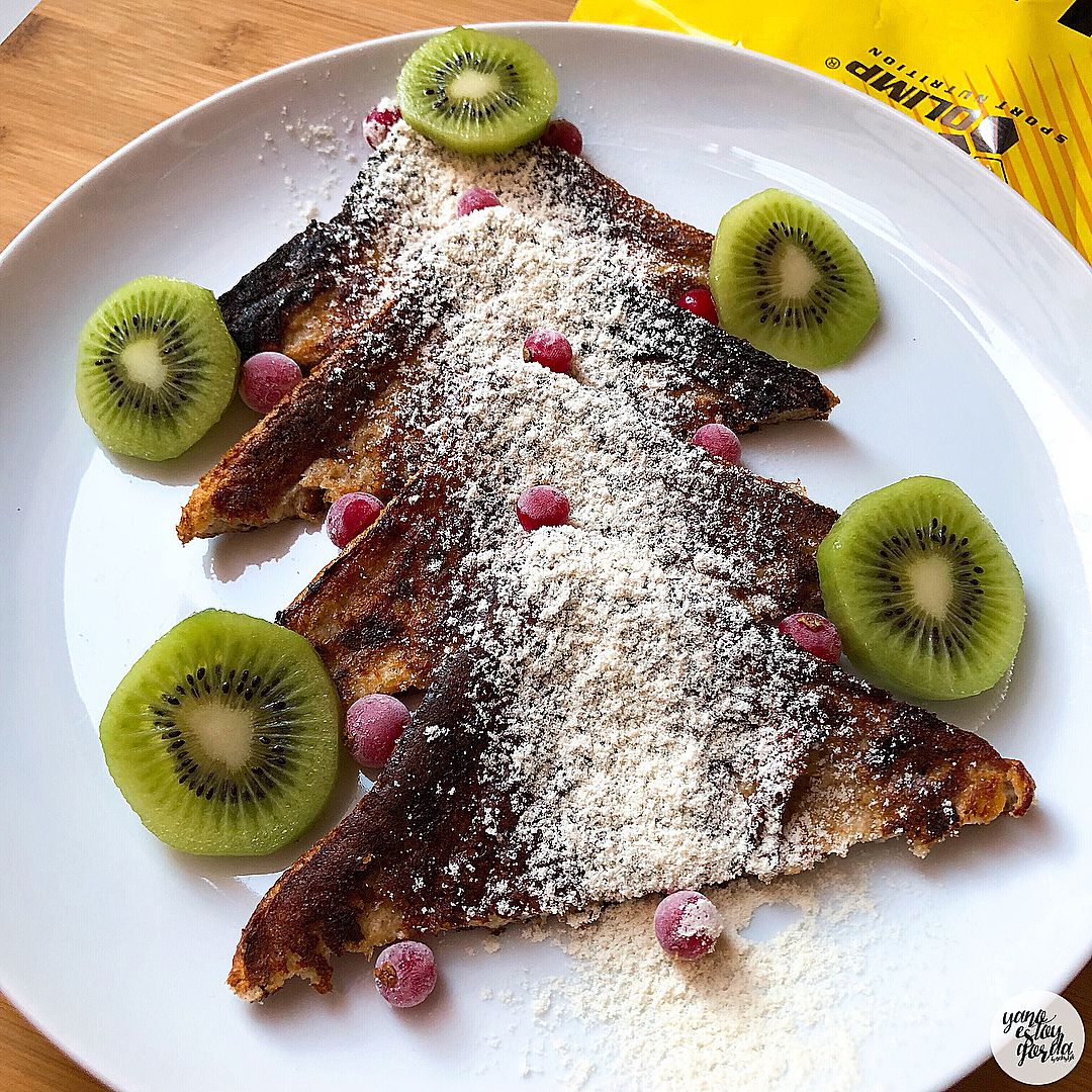 - Mezclamos en un plato hondo las claras junto al chorrito de bebida vegetal y la proteína en polvo.