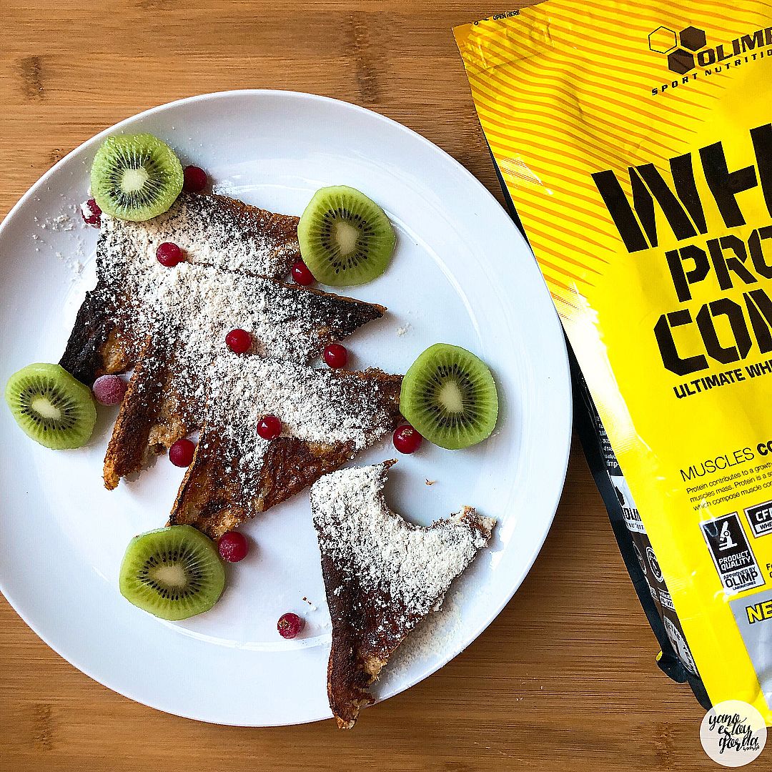 - Servimos con proteína sabor caramelo espolvoreada por encima y frutita.